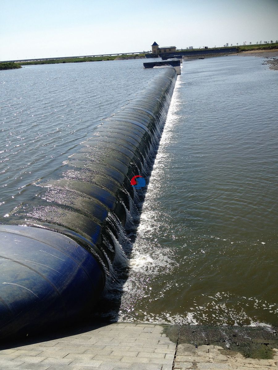 坝长210m,坝高2.7m,斜坡+枕式充水橡胶坝